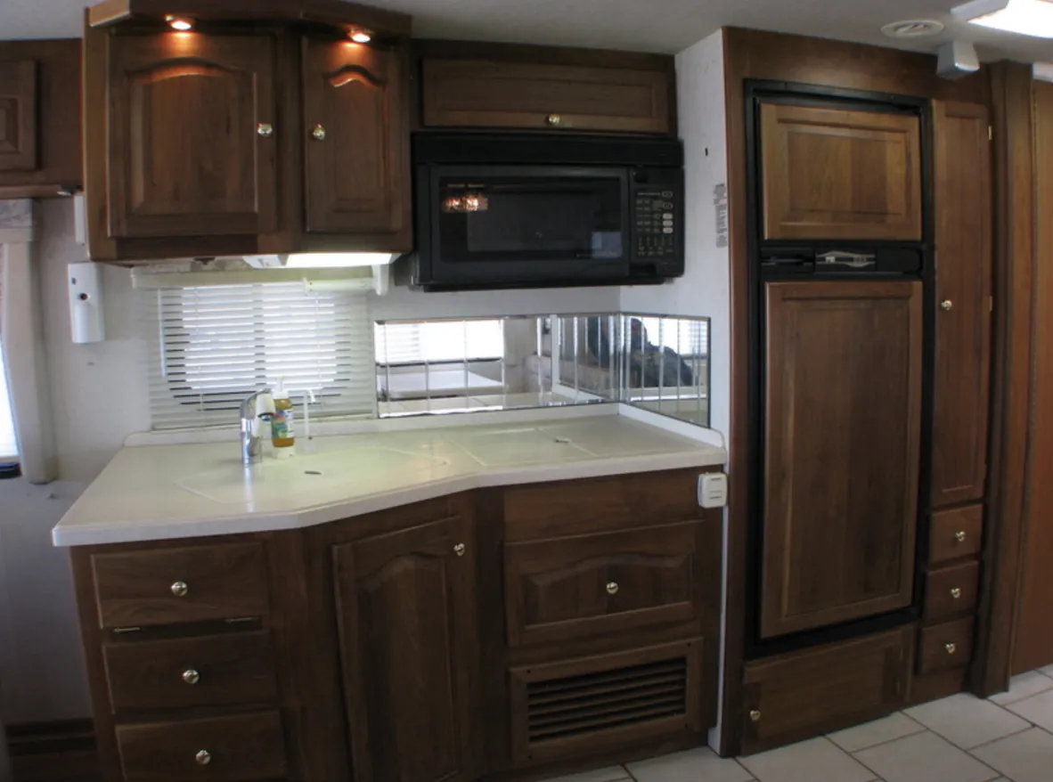Full kitchen with 3-burner cooktop, microwave/convection oven, and 2-door refrigerator