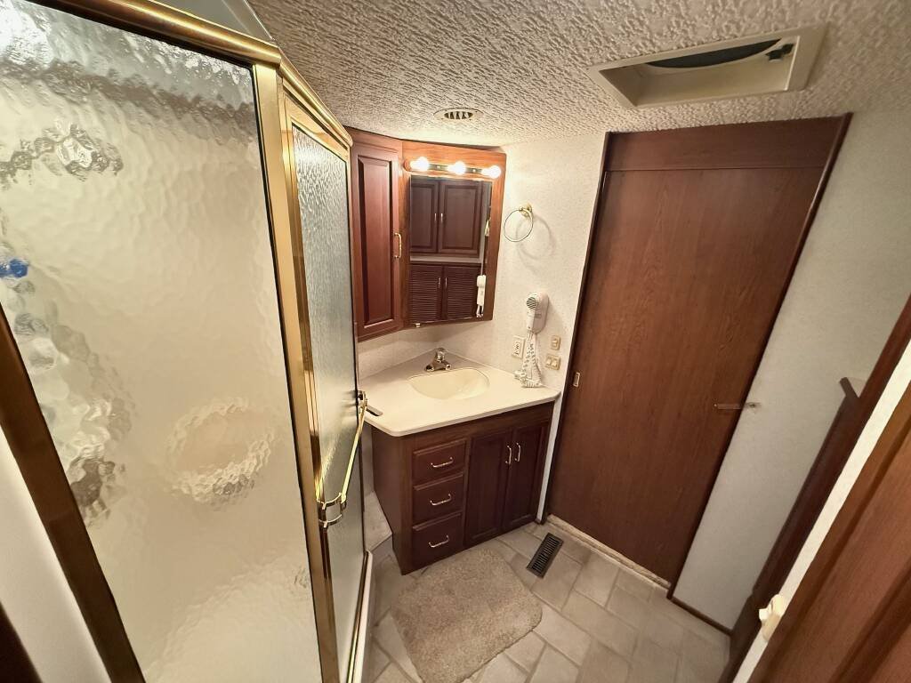 The bathroom features a spacious shower, toilet, and sink, with electric and propane water heaters and a hot water/coolant heat exchange system for instant hot water. A roof-mounted air conditioner and serviced furnace ensure year-round comfort, while the entertainment system with a TV and stereo adds relaxation to your travels. The upholstery and flooring are well-maintained, creating a cozy and inviting atmosphere. A 200ah lithium battery with Victron smart shunt allows for remote monitoring, enhancing off-grid capabilities.