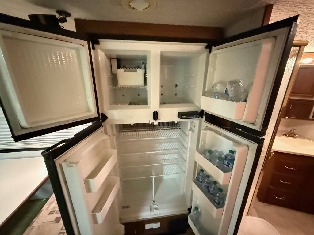 Step inside to a thoughtfully designed interior that comfortably sleeps up to 6 people. The versatile floorplan includes a rear queen bed, a convertible sofa, and a dinette that transforms into additional sleeping space. The kitchen is equipped with a double-door refrigerator/freezer, 3-burner stove, oven, microwave, and double sink, with ample cabinetry for storage. The 90-gallon freshwater tank supports extended stays.