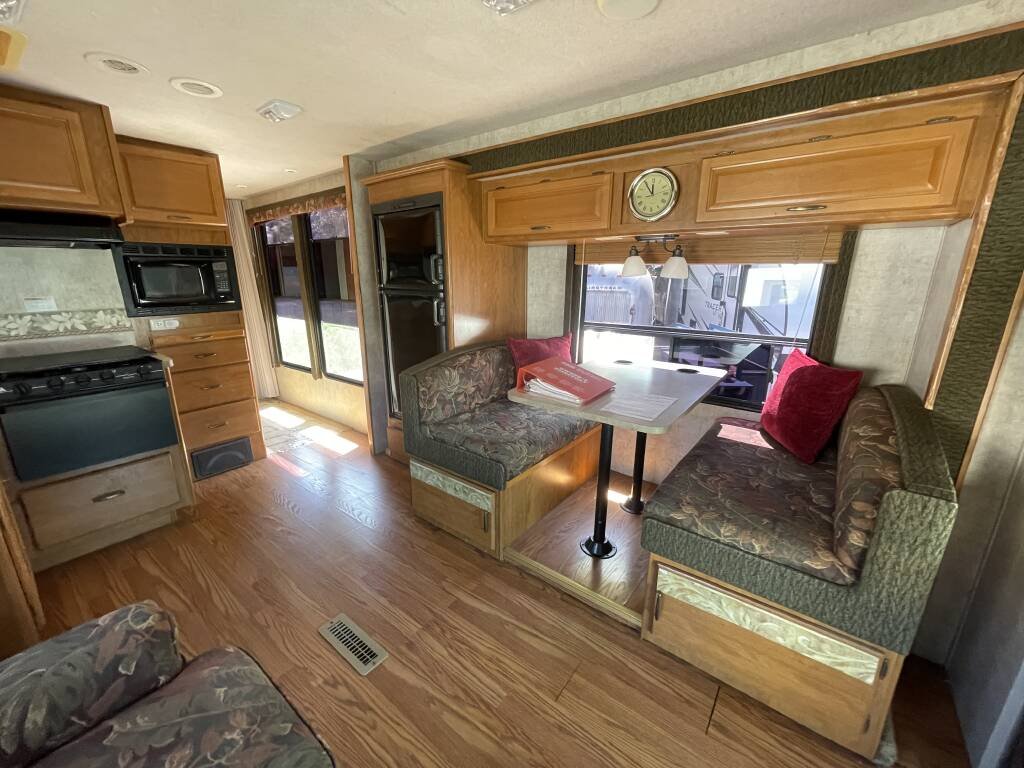 The bathroom offers a refreshing shower, toilet, and sink, with a water heater for warm showers after a day of exploration. A roof-mounted air conditioner and furnace ensure year-round comfort, while the entertainment system—complete with a TV and stereo—adds enjoyment to your downtime. The upholstery and flooring are in excellent condition, creating a warm and inviting atmosphere.