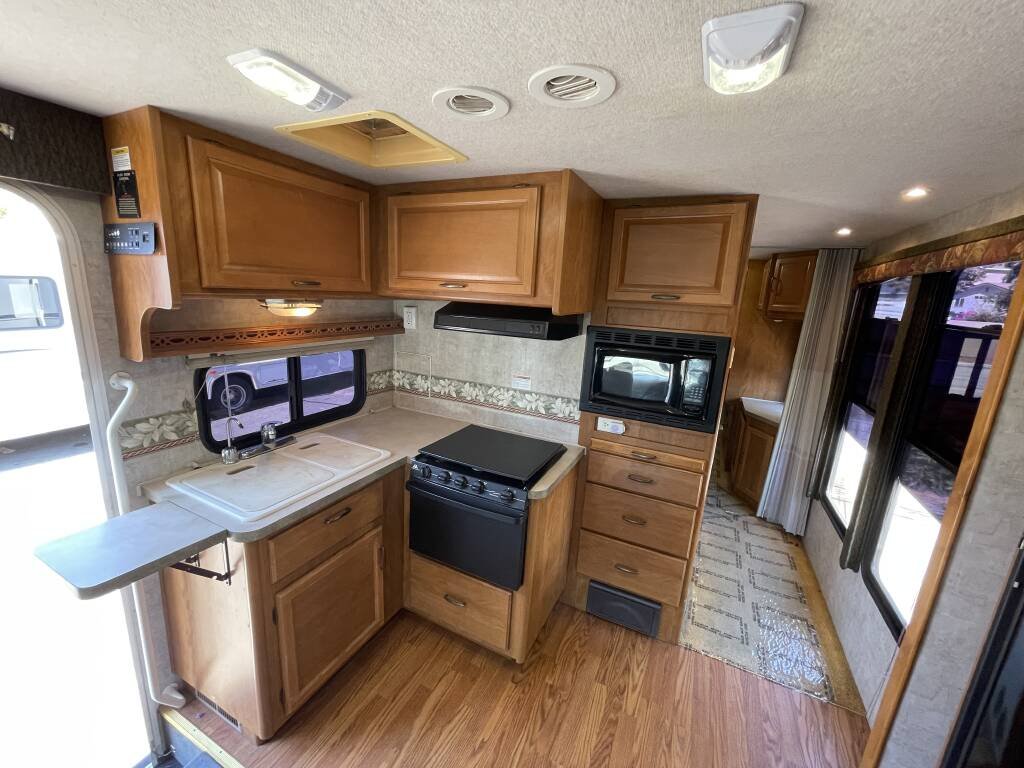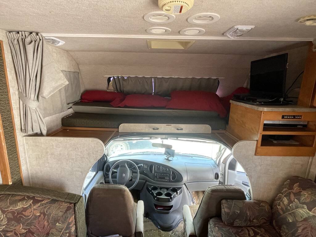 Built on a sturdy Ford E-450 chassis, the Tioga 31M features a fiberglass exterior in a timeless white finish, designed for both durability and aesthetic appeal. Measuring 31 feet in length, it offers ample living space while remaining easy to maneuver. Two slide-outs expand the interior, creating a roomy environment, and a retractable awning provides shade for outdoor relaxation. Generous exterior storage compartments make it effortless to bring along camping gear, tools, and essentials. The aluminum wheels and well-maintained tires ensure a smooth, dependable ride.